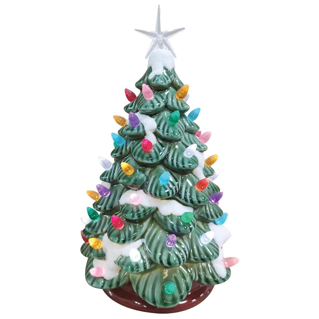 Nothing captures the joy of the holiday season quite like a brightly lit Christmas tree. With a cheerful colored light on each green bough and a sparkling star on top, this snow accented ceramic tree casts a warm glow that infuses the room with holiday spirit.