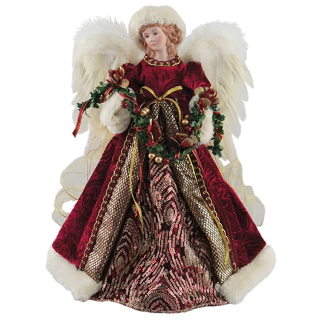 This angel tree topper is wearing a burgundy and cream sequin dress. With red hair and a fur-trimmed hat, this angel will look stunning on any tree or table.