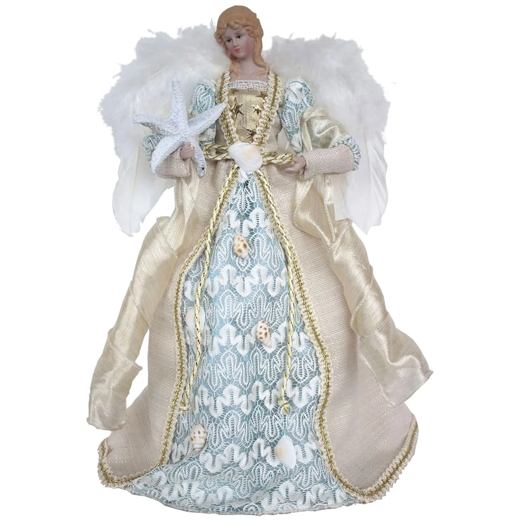 After the lights are strung and the ornaments and tinsel are hung, there’s one final step to make a Christmas tree perfect and that is placing a beautiful decoration on the very top. This exquisitely ornate and wonderfully detailed angel tree topper is a perfect compliment to any tree. Dressed in a classic seafoam blue patterned gown with gold accents and holding a starfish, this angel celebrates the beauty of coastal climates.