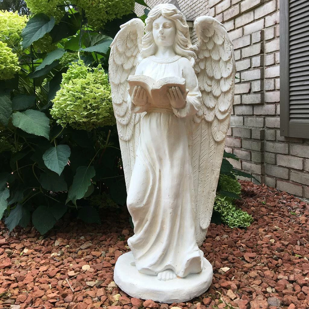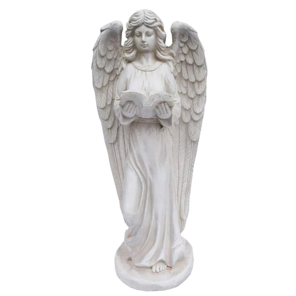 Regal and calm antique white standing angel reading from an open book held in her hands. Cold cast resin to provide many seasons of pleasure.