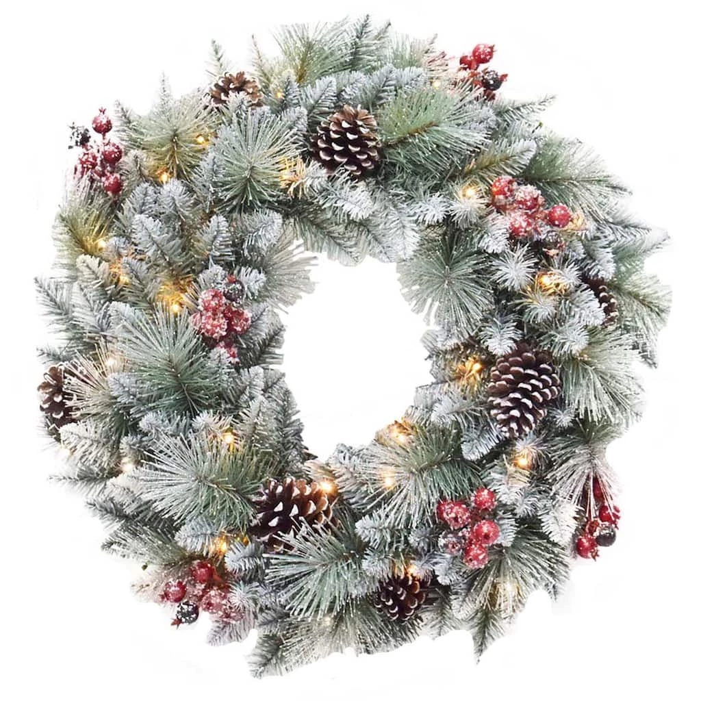 Use Santa’s Workshop 2.5ft. Pre-Lit Glitter Mixed Pine Wreath to bring some classic holiday decor to your doors.Β During the holiday season, coming home to a beautiful wreath hanging on your front door is one of the simple joys of Christmas. This eye catching, flocked wreath has bright white lights and is elegantly decorated with glitter, bright red berries and pinecones. Celebrate the holidays in style with this wonderfully crafted wreath that is sure to provide many seasons of pleasure.