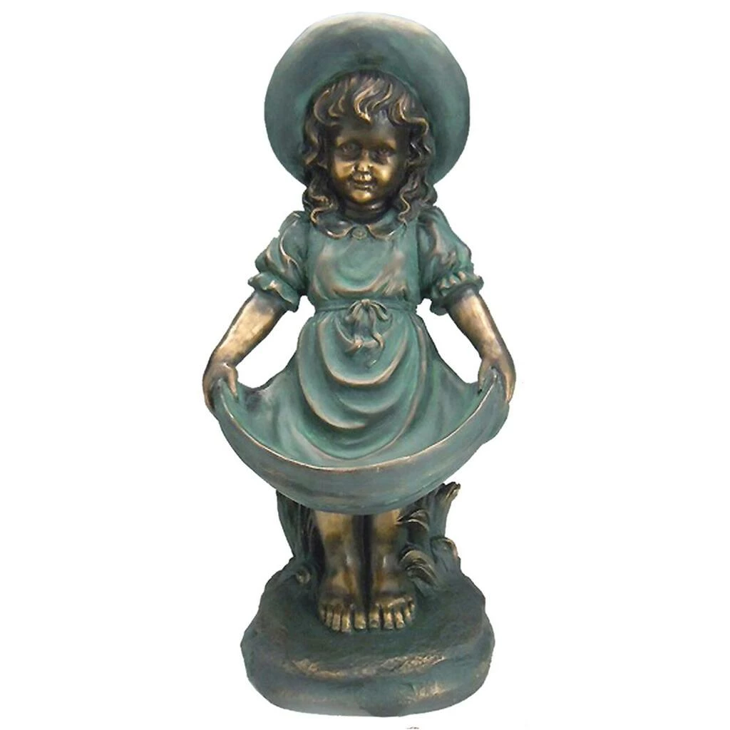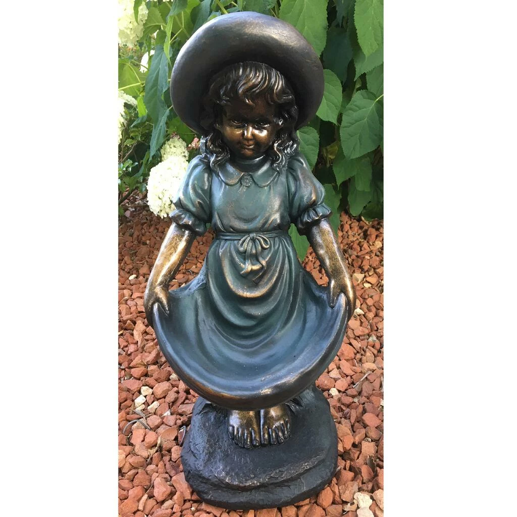 Beautiful bronze colored statuette of little girl happily holding out her dress to hold food for birds. Made of long lasting resin to provide many seasons of pleasure.